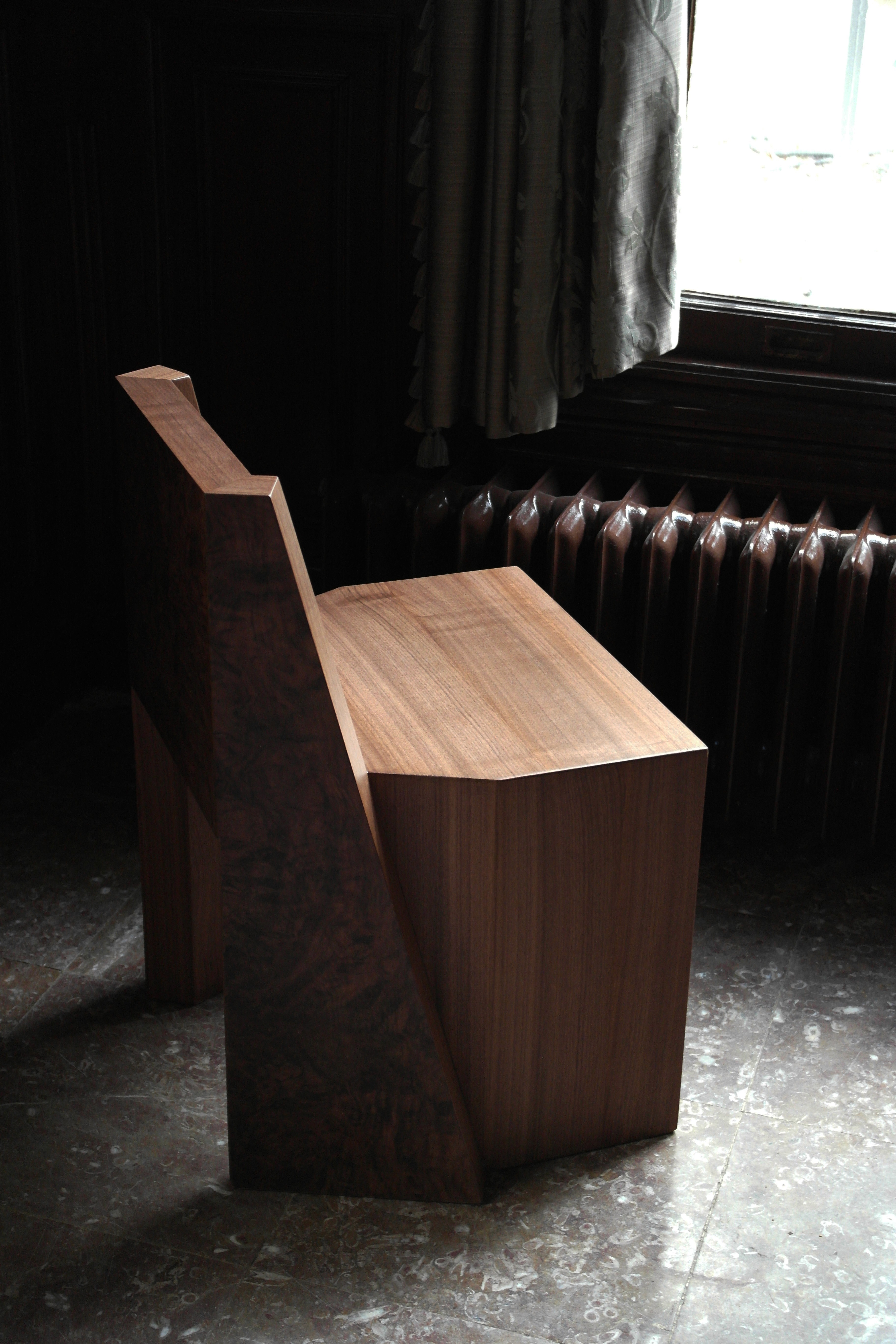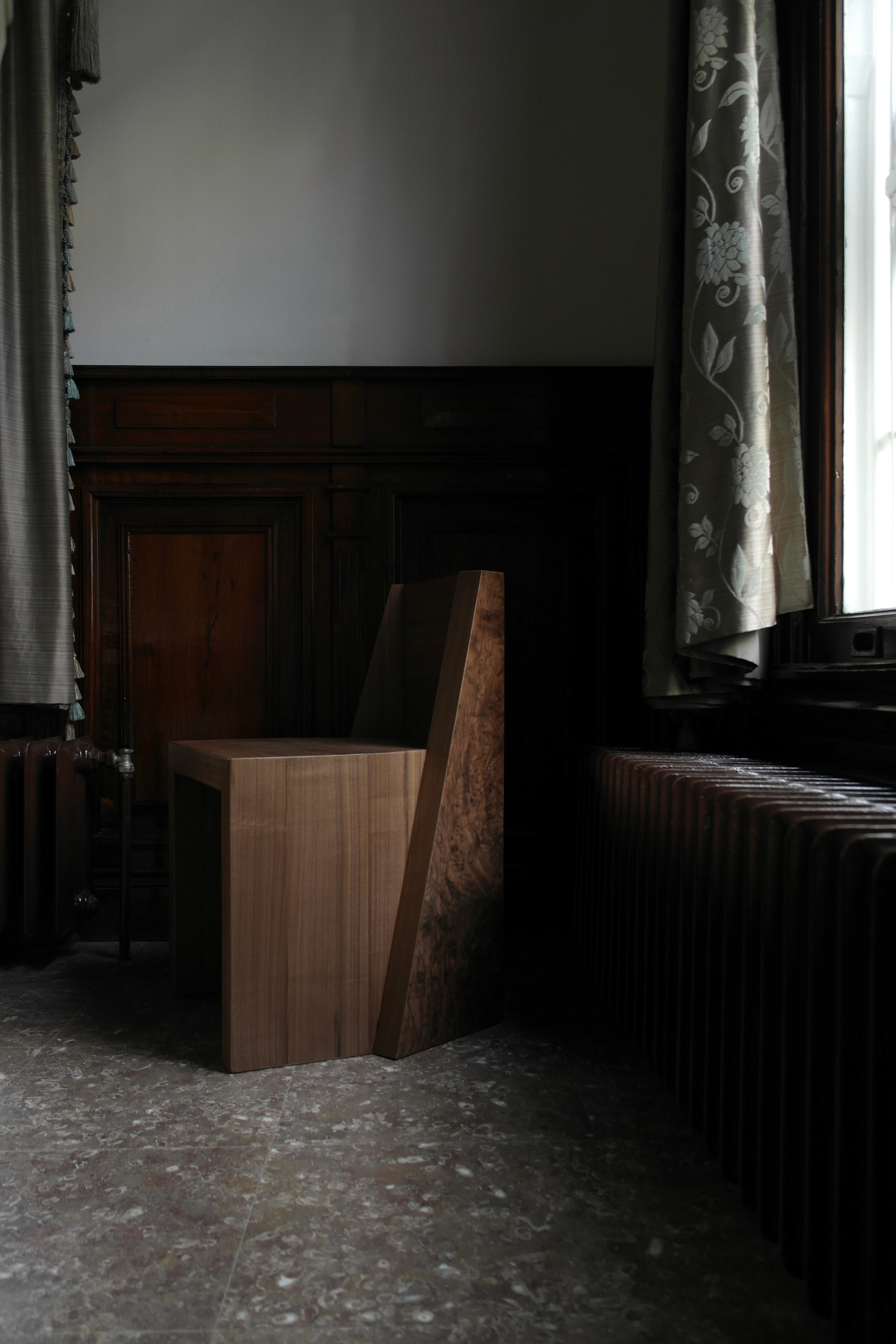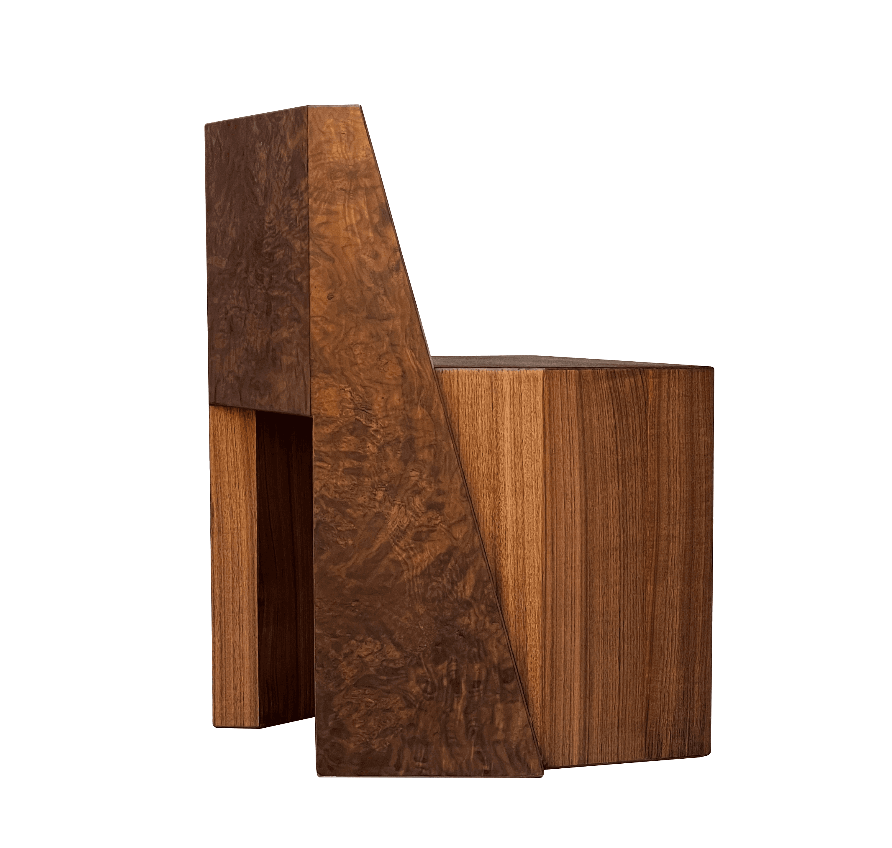 The burl elements, positioned on the sides and the back of the chair, function like a protective shell, an exoskeleton that surrounds the body. With its dense, complex, and intertwined grain, the burl represents one’s roots and community, offering strength, shelter, and a sense of belonging.