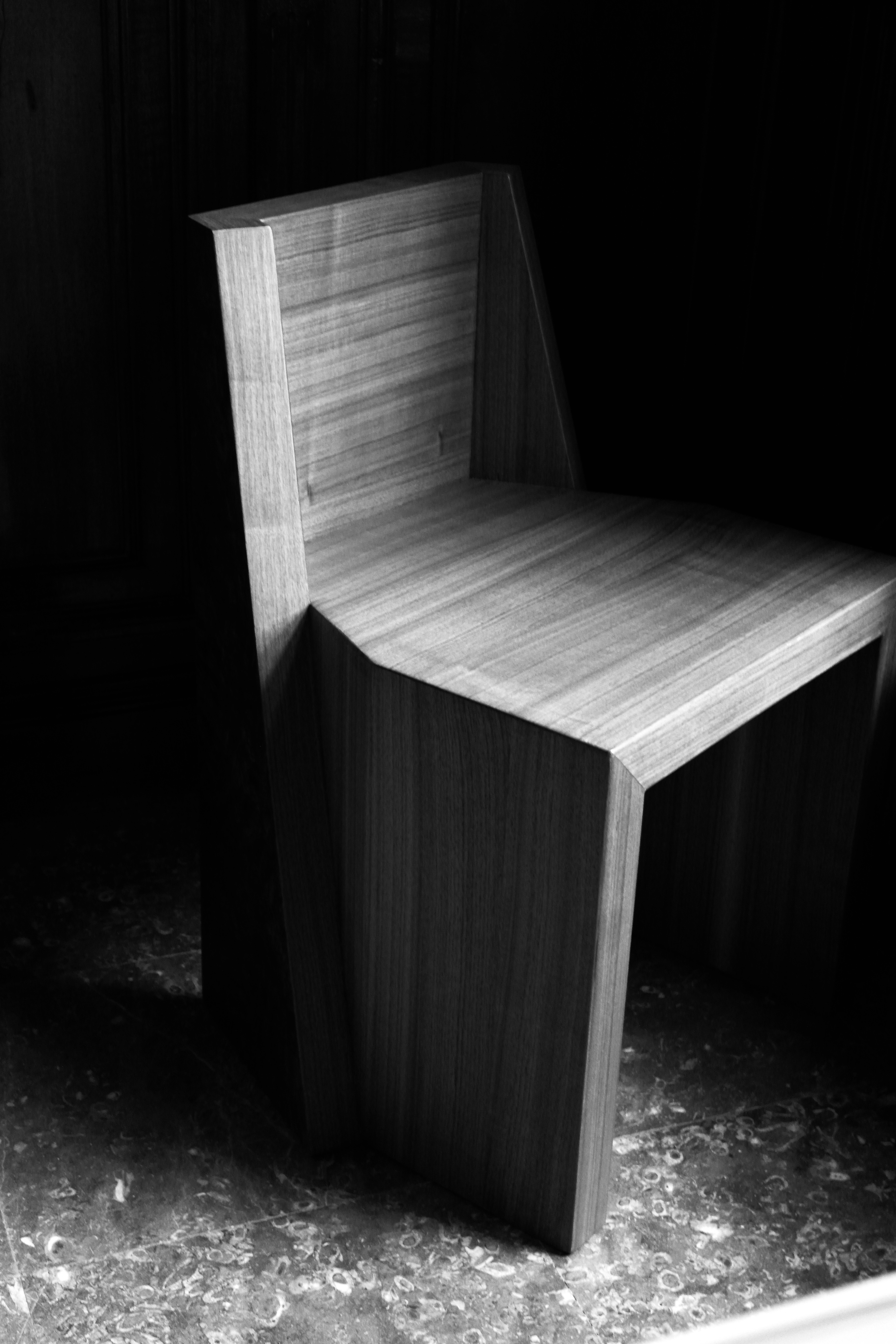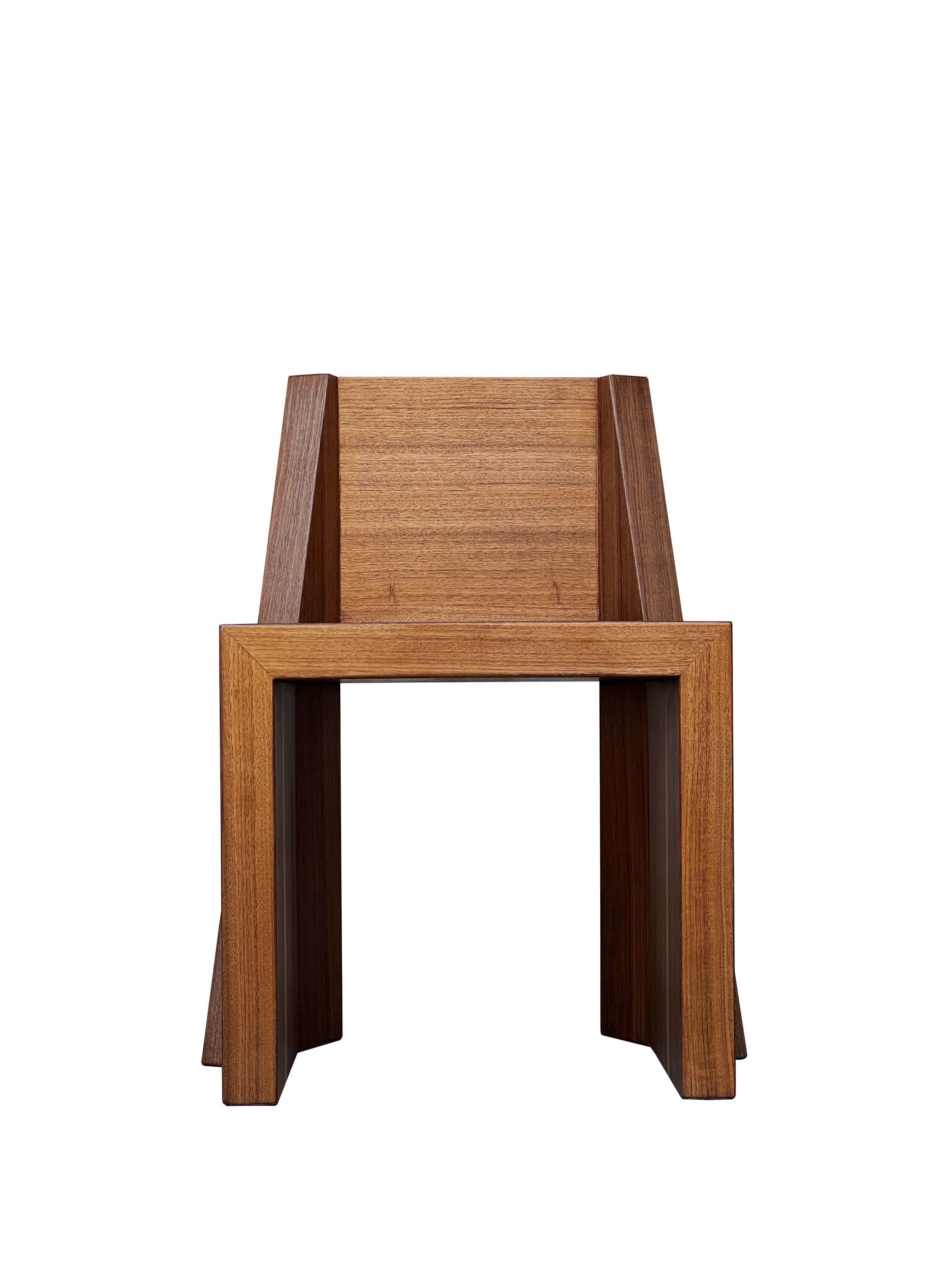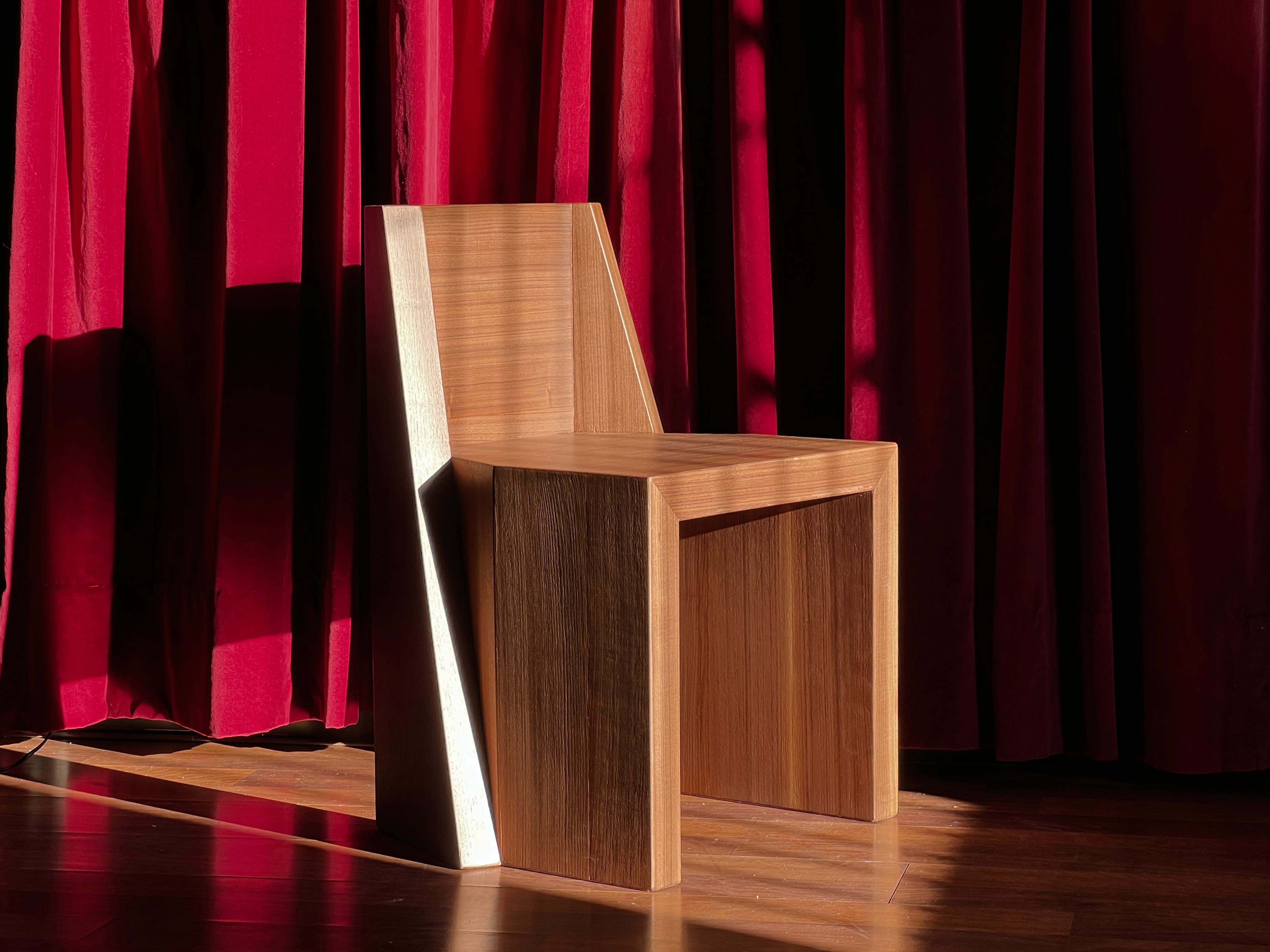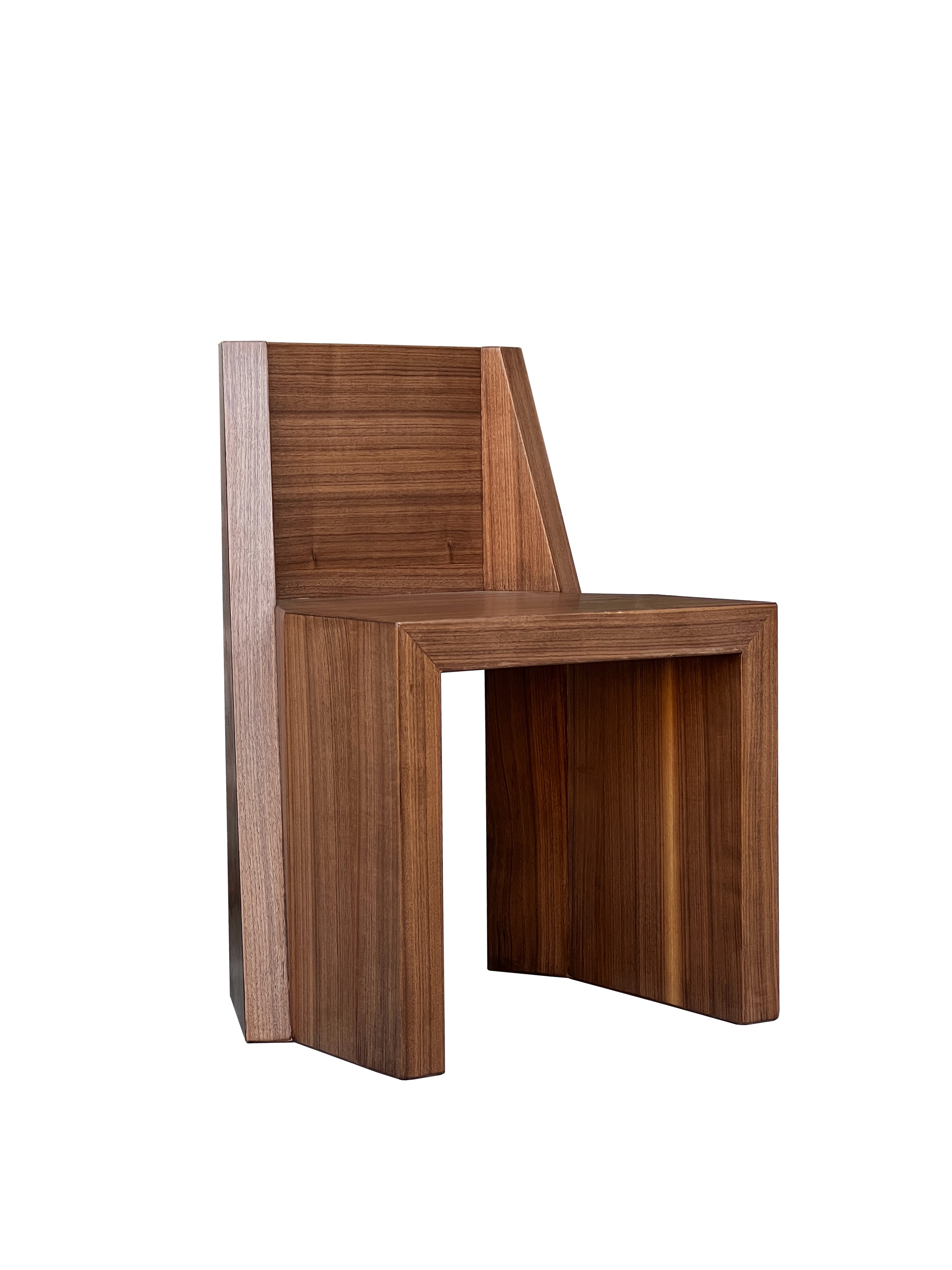 In contrast, the seating surface is made from solid walnut veneer, the softer “belly” of the tree. This inner core provides warmth and comfort through its smooth texture and calm, repetitive grain lines. It is the place of rest, protected, grounded, and embraced by the structure around it.