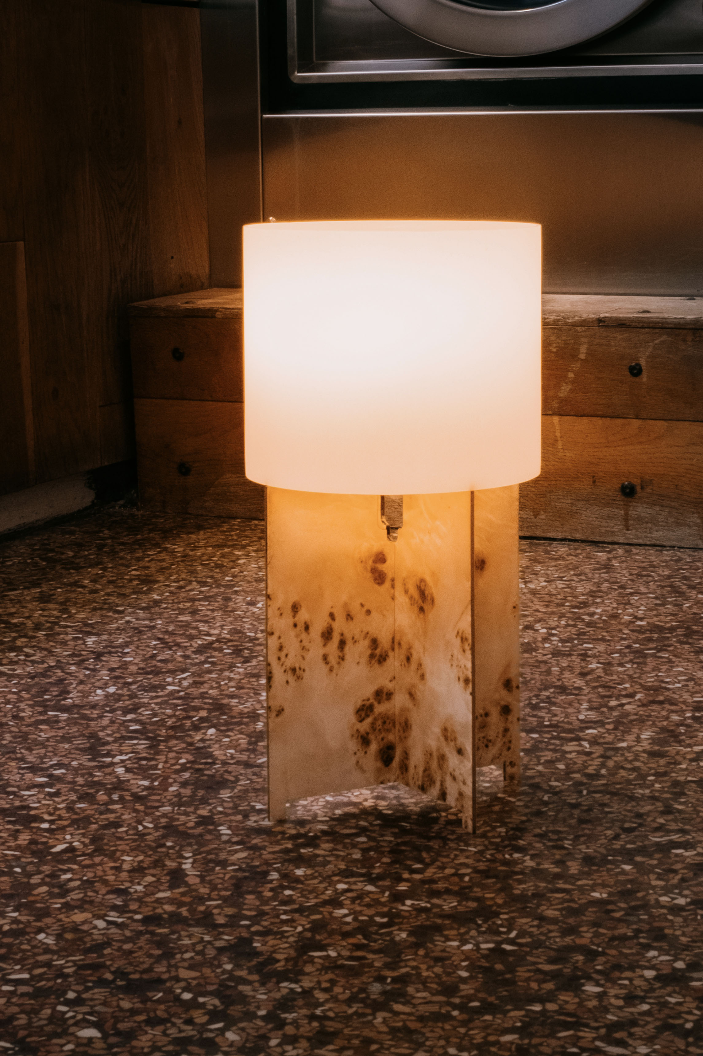 The bright tones and naturally occurring textures of poplar burl create a striking visual effect, making every piece completely unique. Each lamp is then hand-treated in an oud instrument workshop in Istanbul, where traditional craftsmanship meets contemporary design.