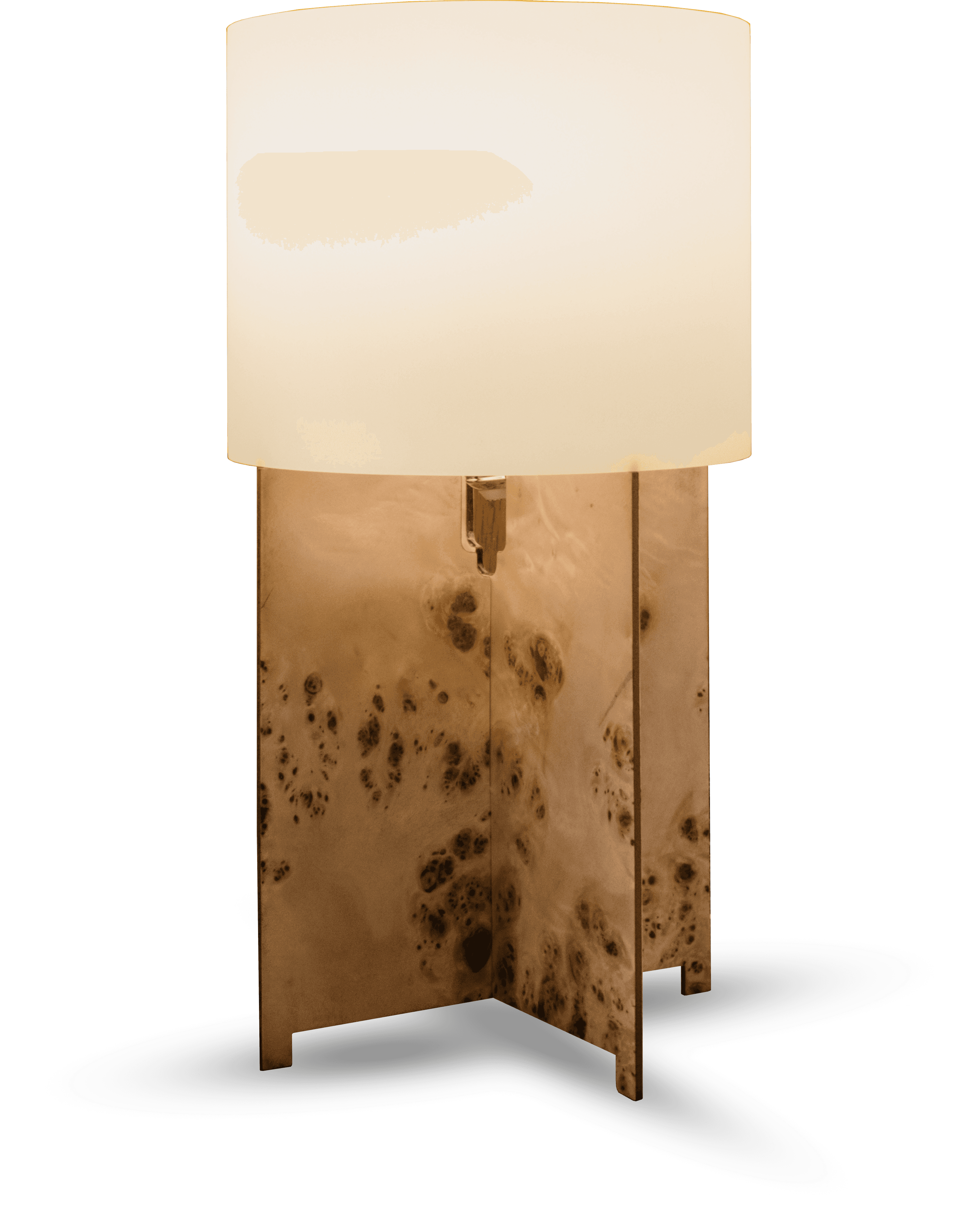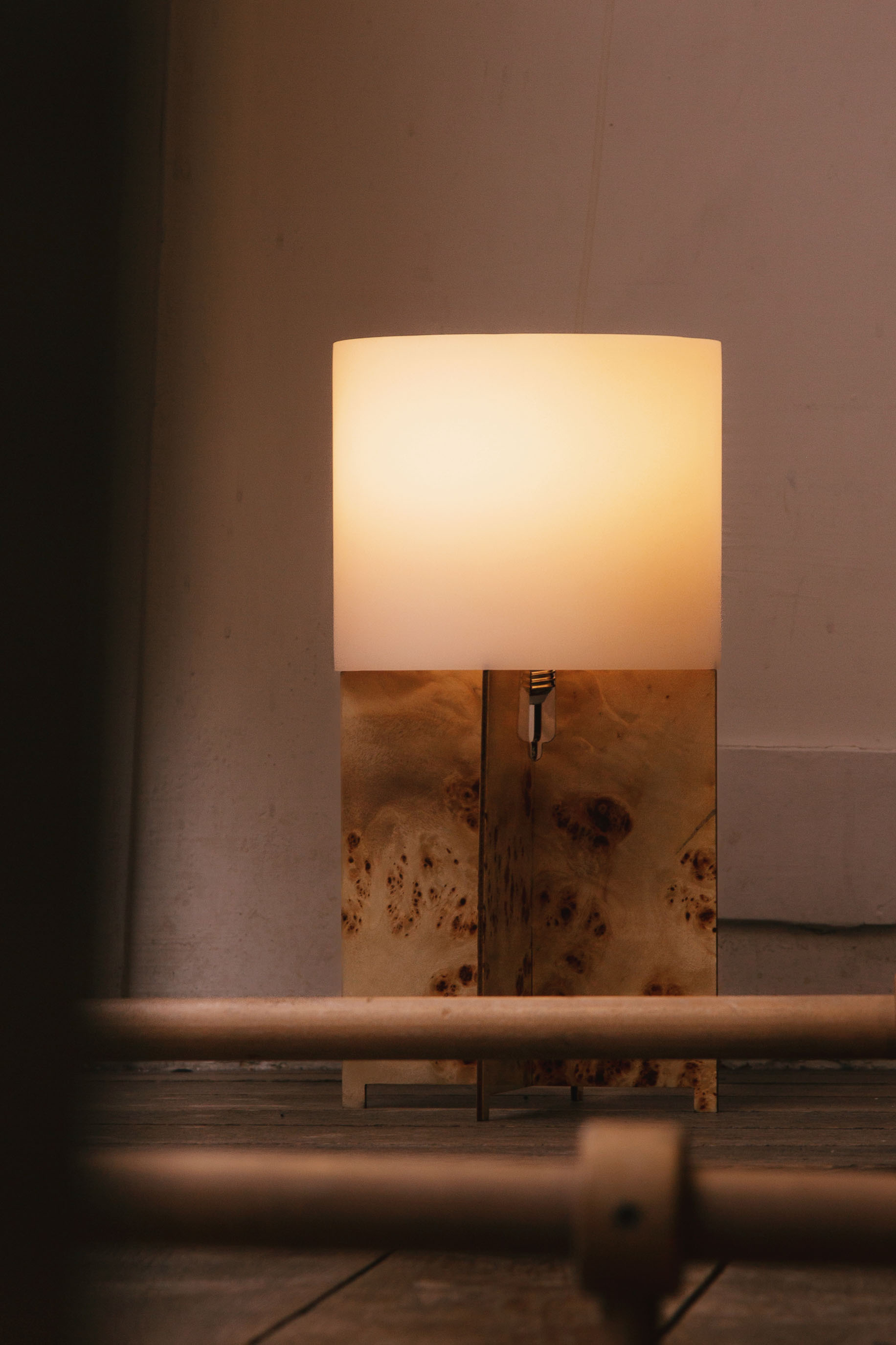 The result is a sophisticated table lamp that diffuses light in a warm, atmospheric way, highlighting the organic patterns of the wood while bringing a soft glow to any space.