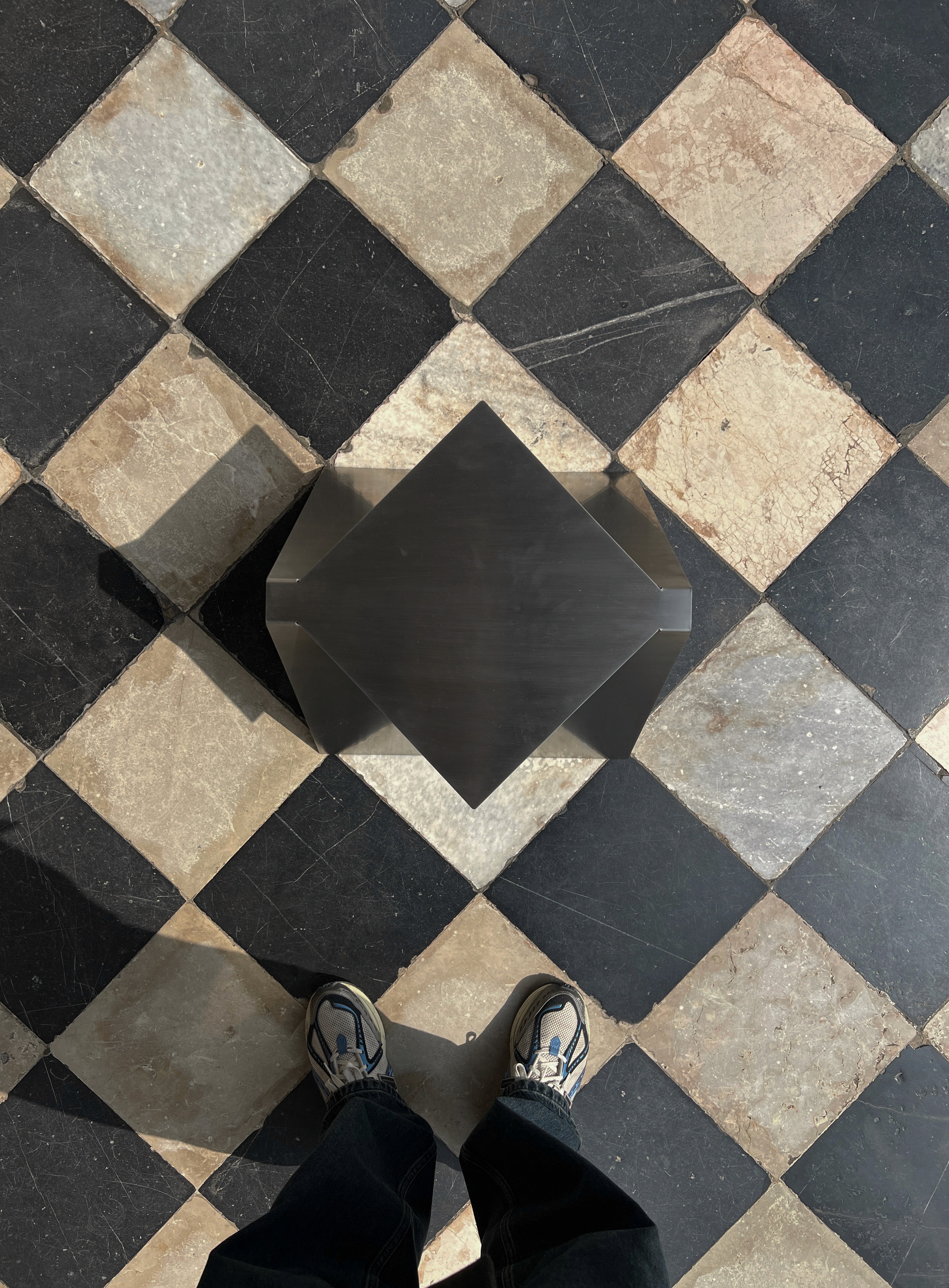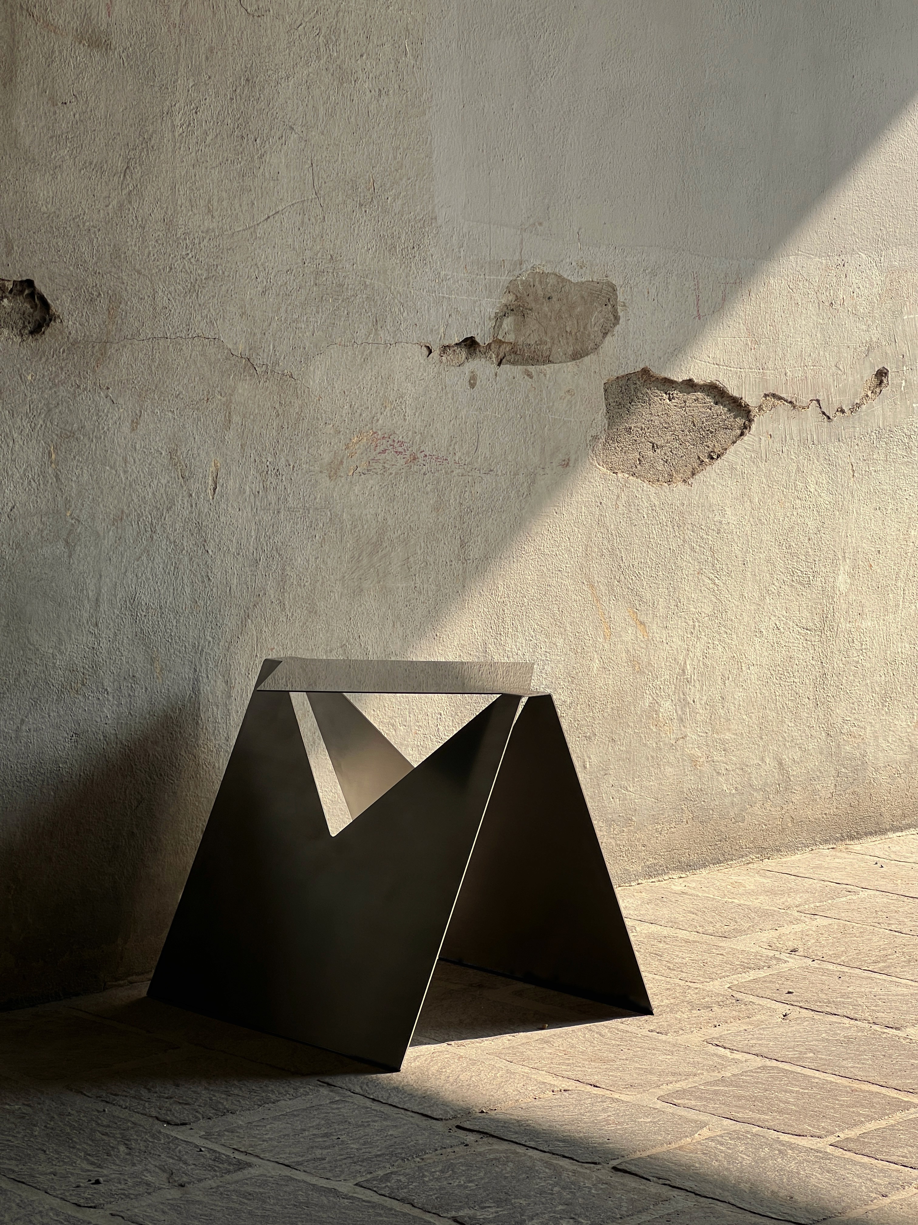 The project translates this playful mechanism into a side table composed of precisely cut and folded metal sheets. Through a careful interplay of cuts, negative and positive surfaces, the design unfolds in space, creating shifting compositions of planes and volumes that evolve depending on the viewer’s perspective.