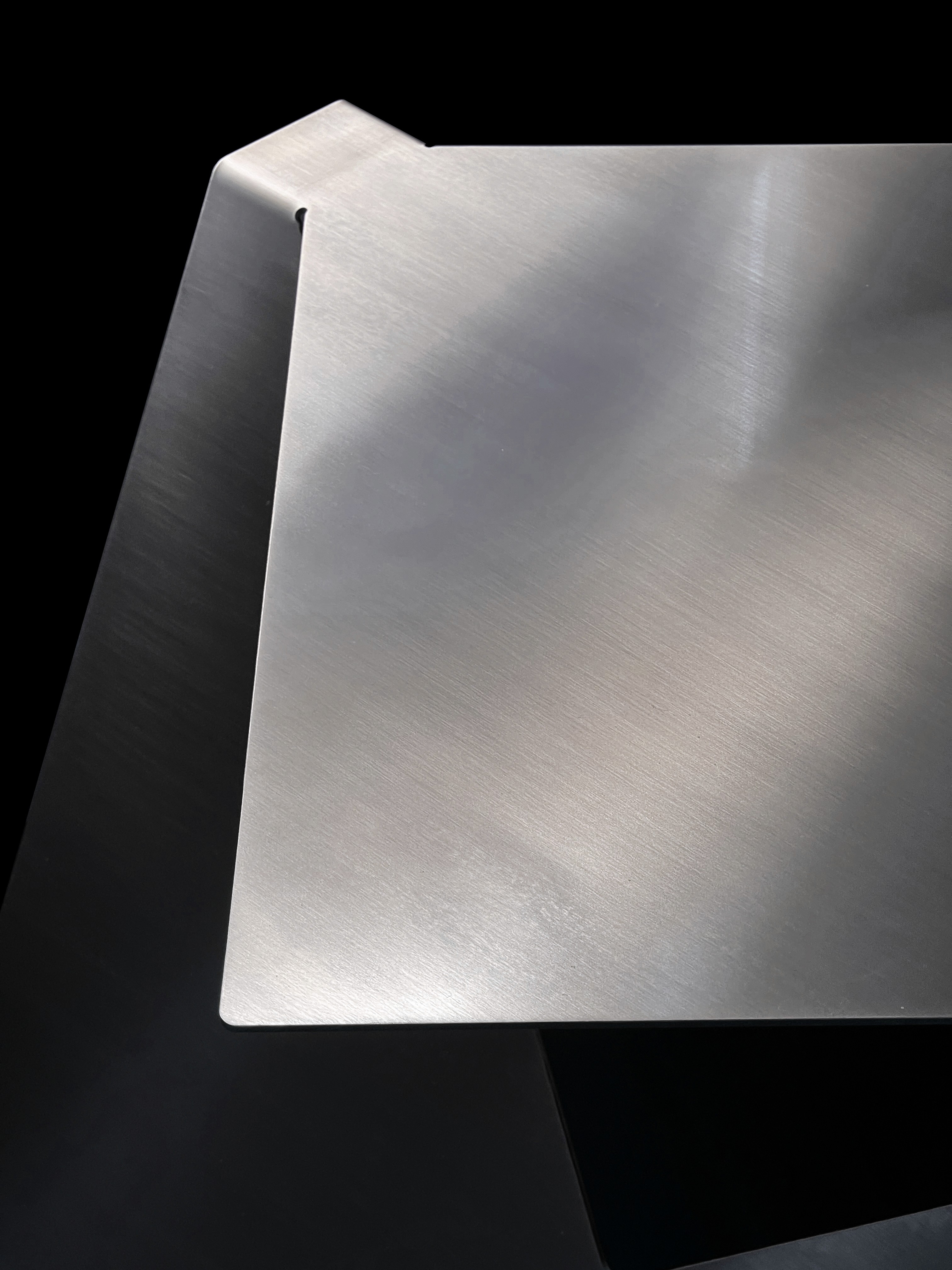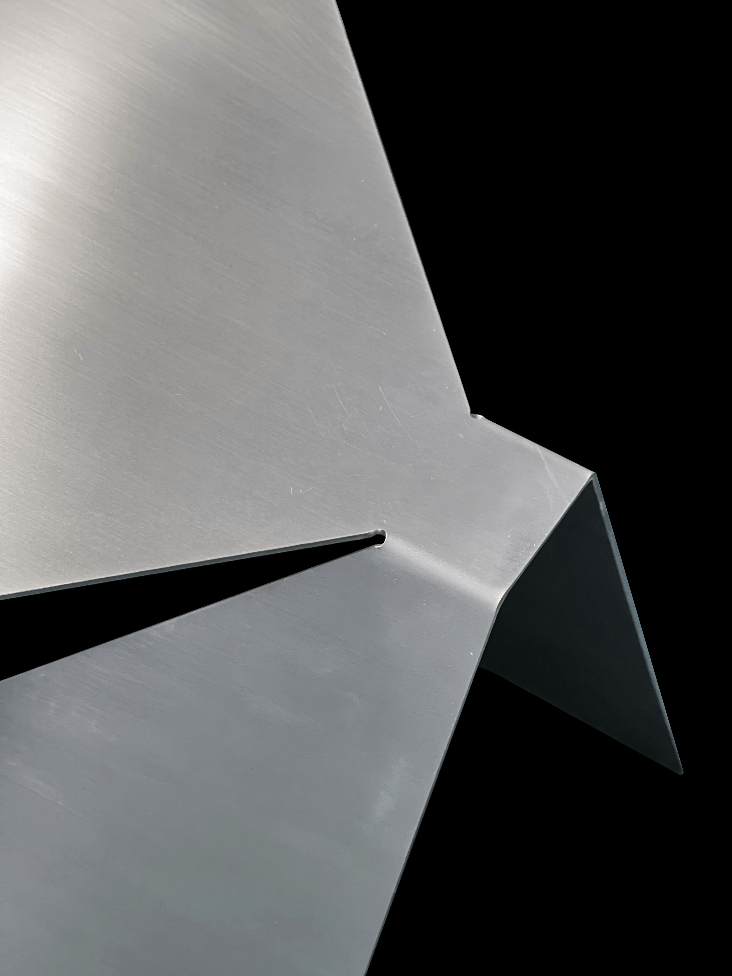 Crafted from a single sheet of stainless steel, the table is laser-cut and then pressed into form. With no additional materials or structural elements, it stands as a study in restraint, where cutting and folding alone define both function and presence.